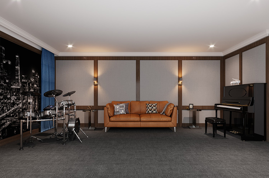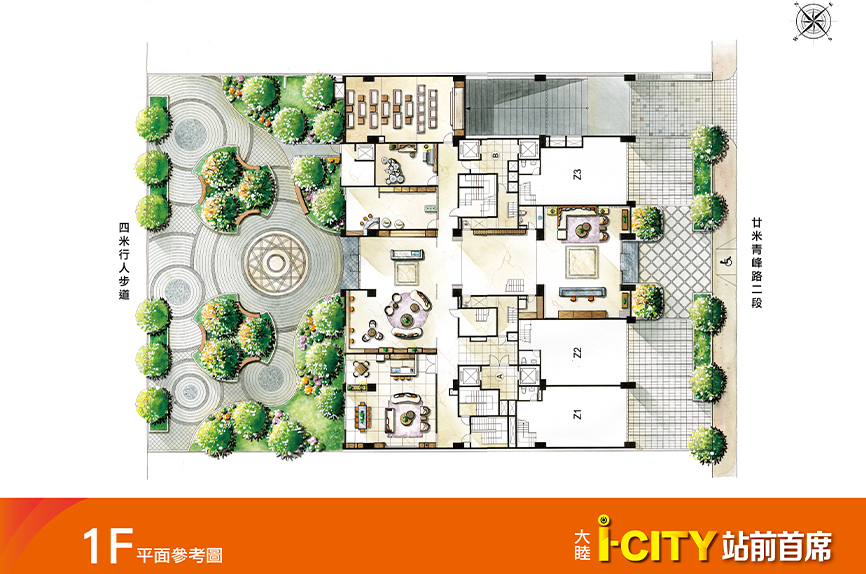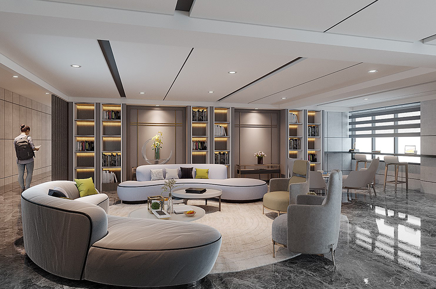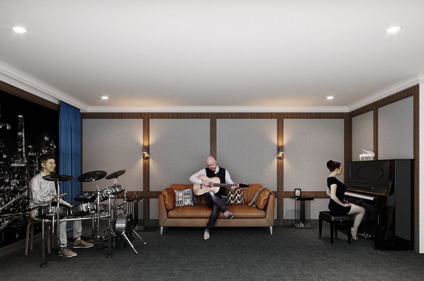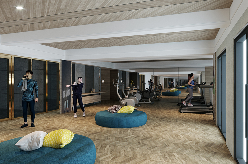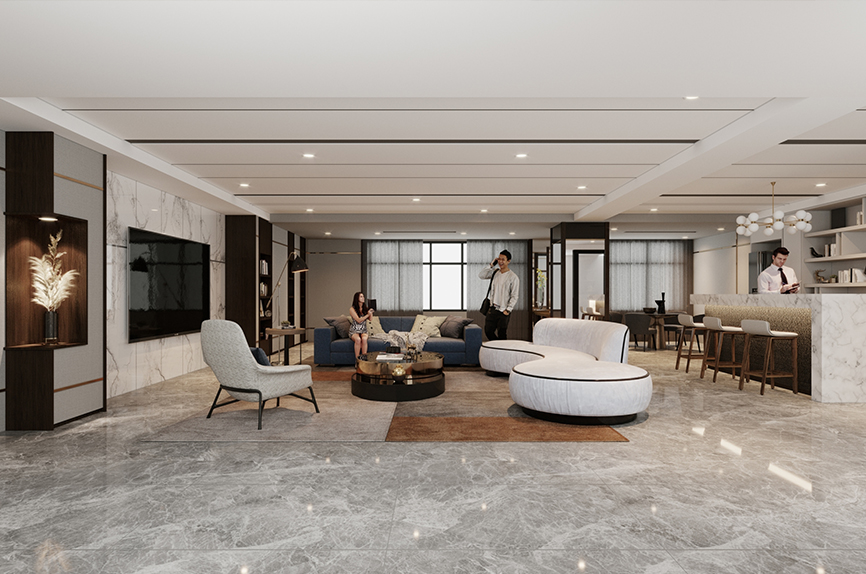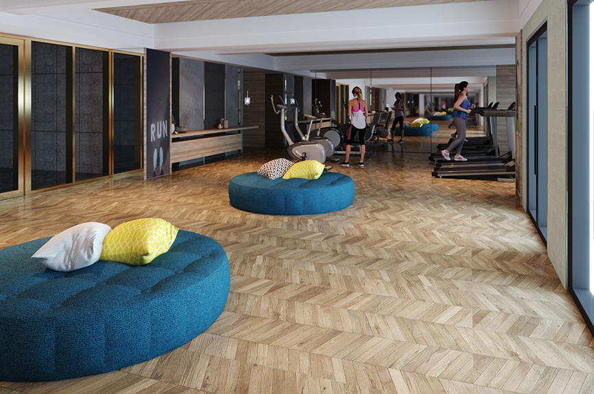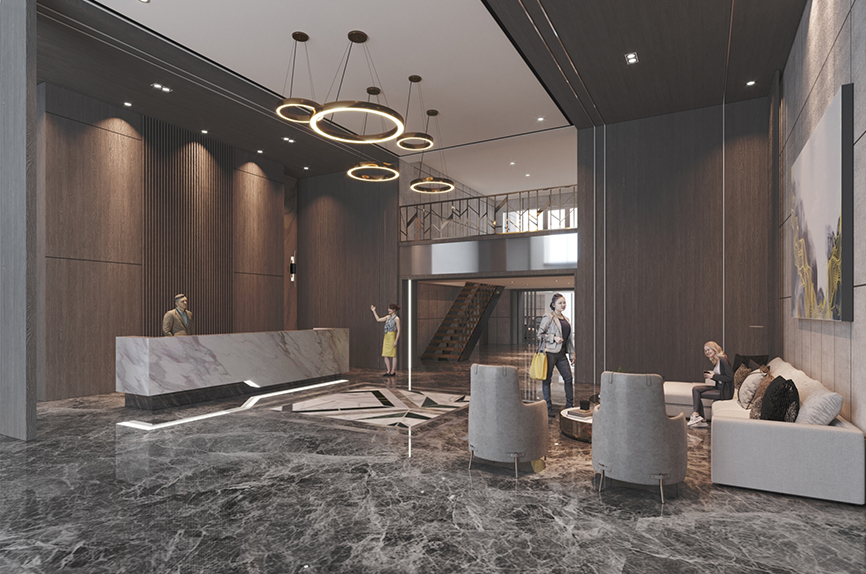 以鑽石八心八箭概念設計的 Lobby。公設規劃動靜皆宜,有交誼廳、專業健身房、琴房。